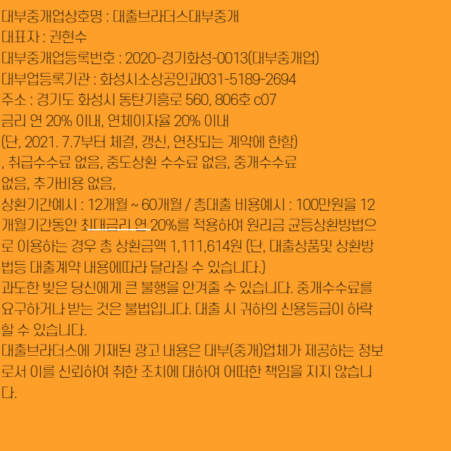 그럼 다른 부분을 한번 볼까요? 우리는 에이스 대출을 이용하면서 가장 힘들어하는 것은 매일 매일 상환해야 한다는 점과. 그 외에 월병 이나 주변 대출도 계속해서 상환을 해야 한다는. 압박감에 시달리고 합니다. 그런 압박감은 무게가 조금이라도 가벼워진다 면 어떻게 될까요? 우리는 그것만으로도 큰 행복으로 다가올 것입니다. 조금이라도 낮은 금리를 추종하고 있는 업체를 만나보고 싶다면 지금 말씀드릴 업체가 적격이겠죠. 다음은 그런 분들에게 안성 맞춤인 전지역 대부 입니다. 여러가지 대출업체를 이용하고 나서는 가장 생각나는 것은 최저 금리로써 이용할 수 있다는 강점 인데 그 부분에서는 타의 추종을 불허합니다. 1번 클릭해보세요.