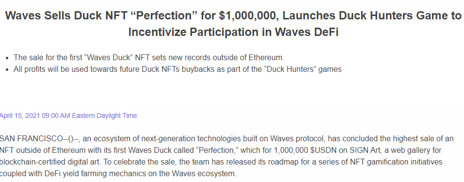 웨이브 프로토콜을 기반으로 구축된 차세대 기술 생태계에서 Wave Duck인 PERFECT를 이더리움(ETH) 외부에서 NFT를 가장 많이 판매한 것은 블록체인을 인증했던 Digital Art 용 웹 갤러리인 Sign Art에서 10억 달러에 육박하는 가격으로 마감했다고 합니다. (+Waves 5주년)
