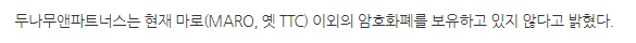 오늘 알아본 코인은 마로(MARO) 였습니다. 두나무와 긴밀한 관계가 있는것처럼만