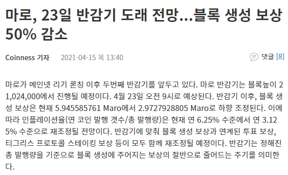 반감기는 보통 시세에 긍정적인 영향을 주지요. 4월 23일 반감기로 오전 9시에 예정되었었습니다.