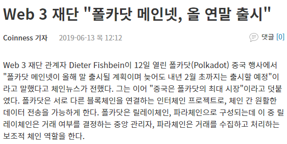 폴카닷 메인넷이 19년도 말 출시될 계획
