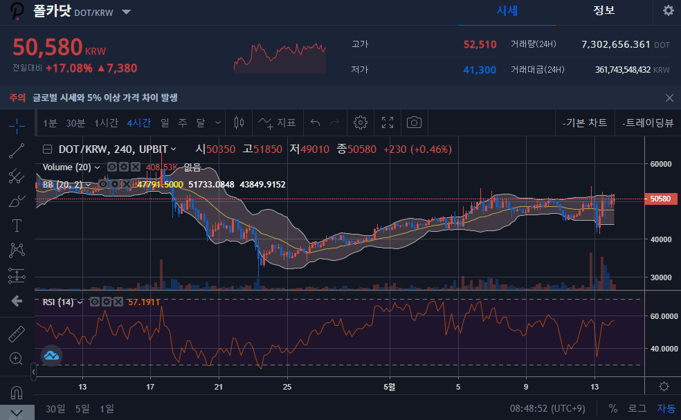 | 거래량(24시간 업비트 기준) | 7,128,473,204 DOT |