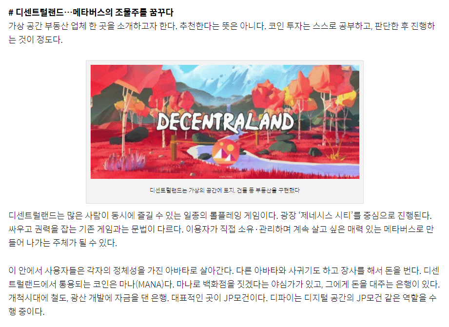 (*디센트럴랜드는 다른 가상세계 및 소셜 네트워크와 달리 중앙 집권화 된 조직이 관리하지 않는다.)