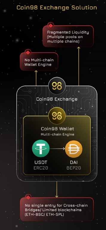 대다수의 디파이 생태계에서는 ETH체인만 지원하기 십상인데 Coin98은 모든 코인의 체인을 지원한다는 것이지요. 이게 기술적으로 가능하다면 엄청난 기술입니다. 그전에는 예를들어 ERC 토큰을 BEP토큰으로 바꾸기 위해서는 거래소 지갑으로 옮겨서 팔고 다시 사서 지갑으로 옮기는 방식으로 했거나 같은 ERC로 스왑한뒤 가져오는 방법을 쓰는데요.