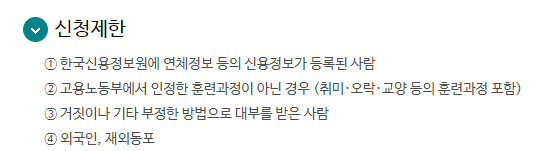신청이 제한되는 요건은 아무래도 한국 신용정보원에 연체정보와 신용정보가 등록된 사람이나 고용노동부가 인정한 훈련과정이 아닐 경우 거짓이나 기타 부적절한 방법을 통해서 대부를 한 전력이 있는 경우입니다. 당연하게도 외국인과 재외동포는 불가능하다는 것도 알려드립니다.