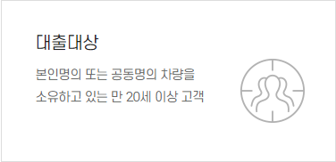 또한 대출 조건으로 본인 명의 또는 공동명의 차량을 소유하고 있는 만 20세 이상의 고객이여야 합니다. 미성년자라면 자동차를 운전할 수 없으며 차량 또한 소지하지 않고 있겠죠? 그렇기에 대출이 불가합니다. 비슷 한 조건의 다른 대출이라면 다음과 같습니다.